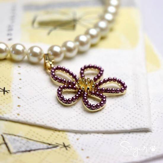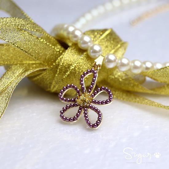 パープルビーズで縁取られたお花のチャームがポイントのキッズパールネックレスです。